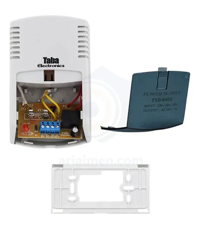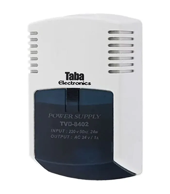 ترانس 8402 دارای باکس سفید رنگ است که در مرکز آن لوگو تابا قرار دارد. در قسمت جلویی باکس درب مشکی رنگ قرار دارد که با علاوه بر دسترسی به درون محصول با اطلاعات حک شده بر درب از میزان قدرت انتقال انرژی ورودی به درون دستگاه و مقدار خروجی آن مطلع می شوید. ترانس پنل زنگ تابا الکترونیک برای راه اندازی نیاز به ولتاژ 220 ولت دارد و با تنظیم جریان در خروجی به شما قدرت 24 ولت 1 آمپر را تحویل میدهد. منبع تغذیه TVD-8402 به دلیل داشتن قدرت بالاتر از انواع قفل برقی و مدل های متفاوت آیفون تصویری تابا با سیم کشی زیاد پشتیبانی می کند. این سیستم به صورت کمکی در کنار ترانس TVD-8401 نصب می شود تا در زمان افت فشار و کشیدن شدن برق اضافی توسط سیستم ها به کمک آن بیاید.